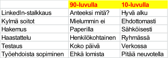 Täältä 10-luvulta katsottuna 90-luvun menetelmät olivat suorastaan passivoivia. Ei ollut tietoa, että ketä kontaktoida. En osannut arvata minne tehdä itseään tykö. Tai kuinka erottua ennen varsinaista valintaa. En voinut edes olla aktiivinen some-kanavissa.